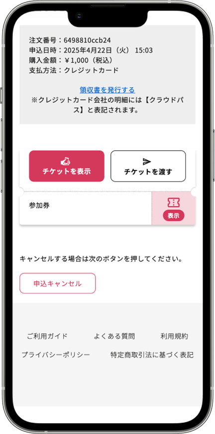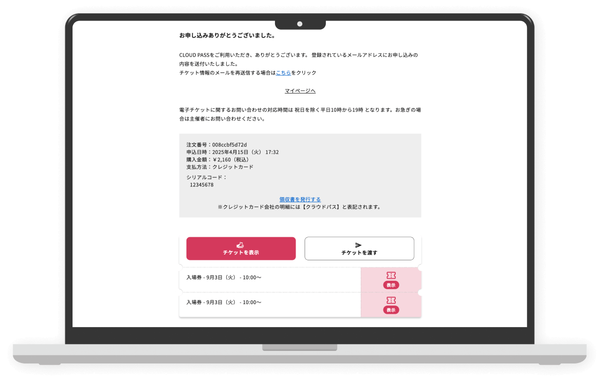 取引が正常に完了すると、チケットが登録済みのメールアドレスに送付され、マイページからも確認できます。