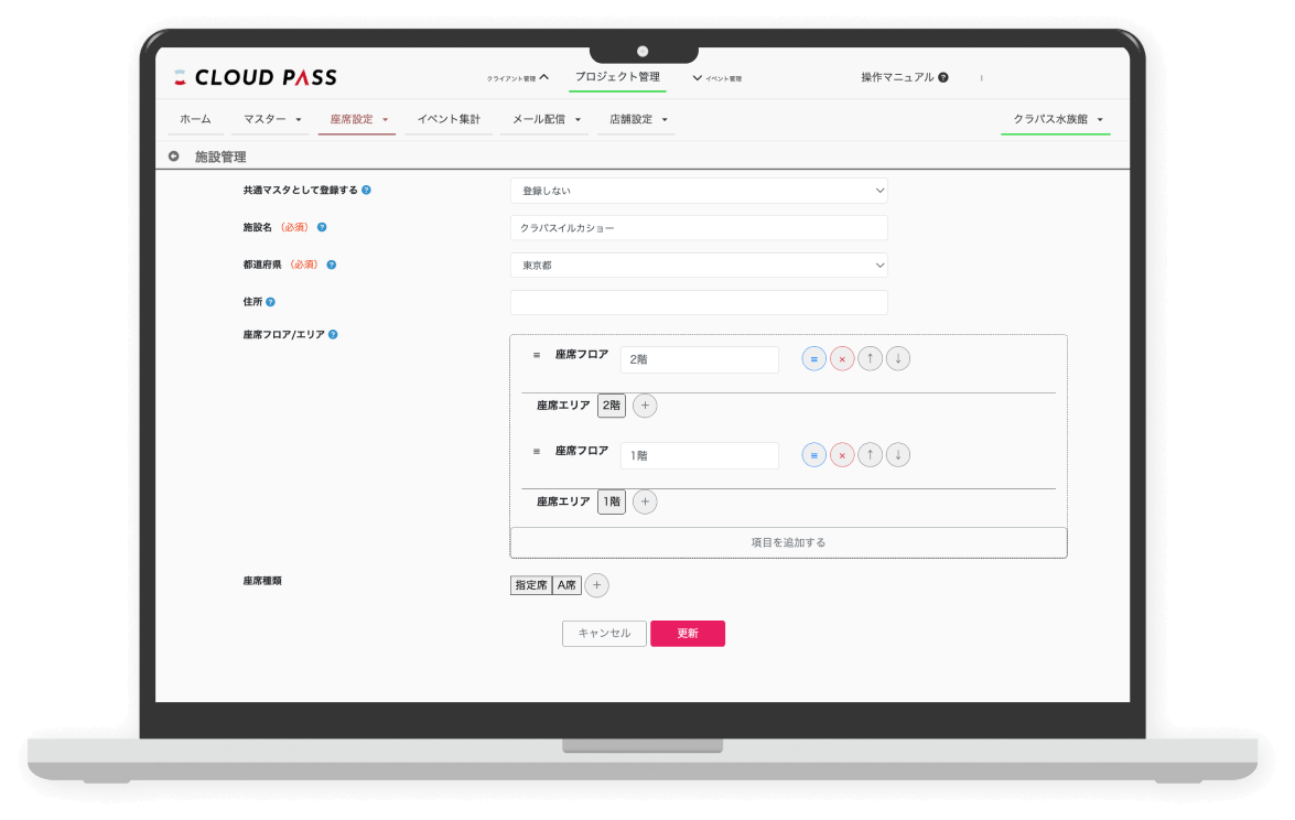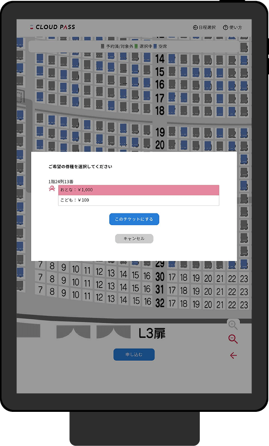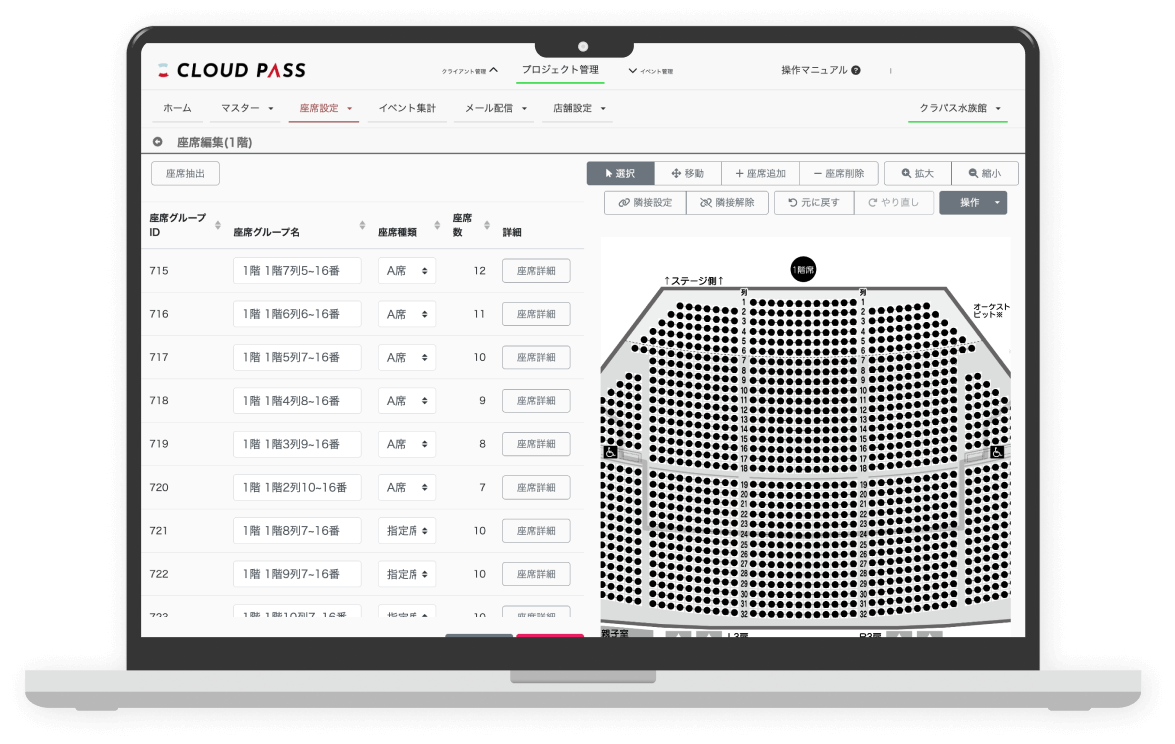 各フロアやエリアごとに、「A席」「指定席」「VIP席」「一般席」など、異なる座席種類を自由に設定できます。