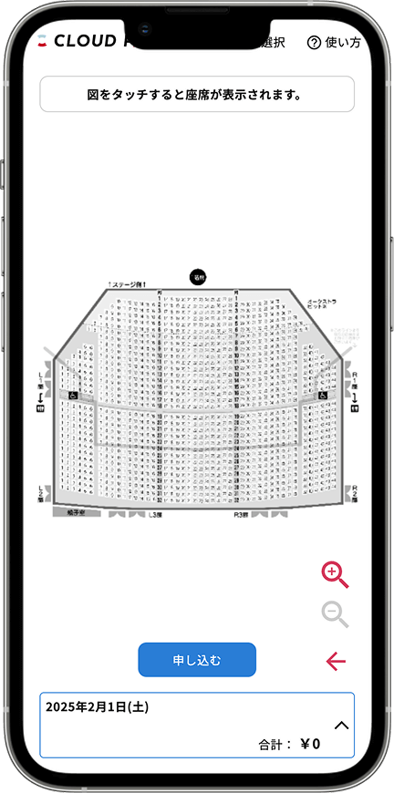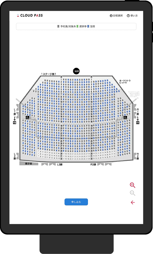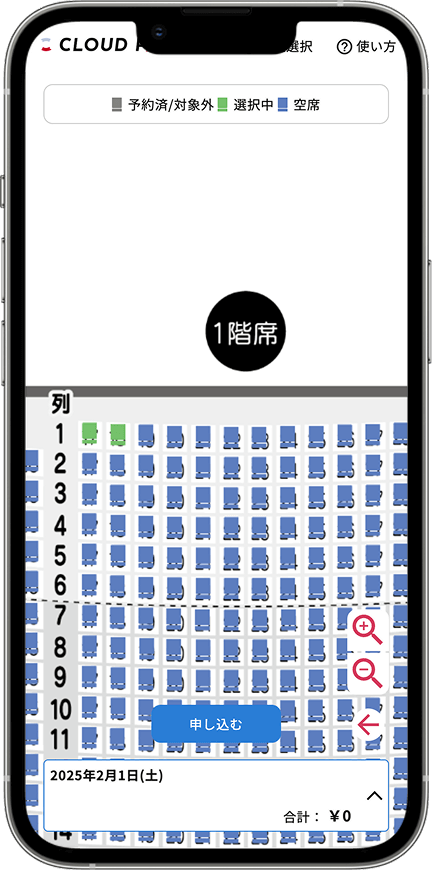 画面のピンチイン・ピンチアウト操作や、+−ボタンで座席図を拡大・縮小できます。