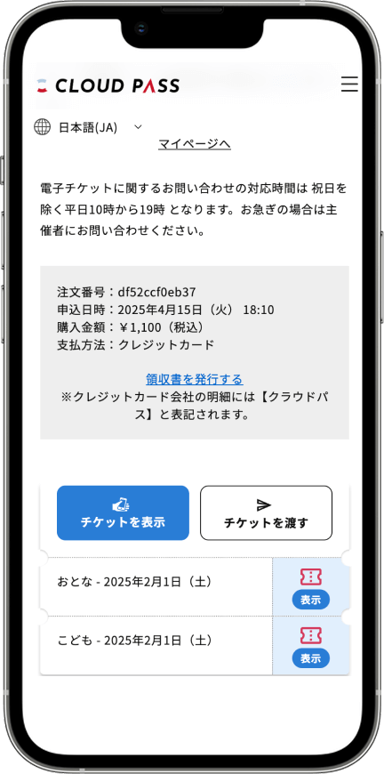 取引が正常に完了すると、チケットが登録済みのメールアドレスに送付され、マイページからも確認できます。