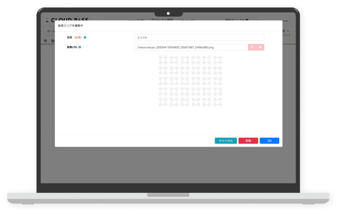 管理画面の「公演設定」より、会場情報と座席図面を登録。