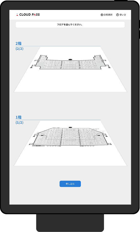 表示された会場図面から、希望するフロアやエリアを選びます。