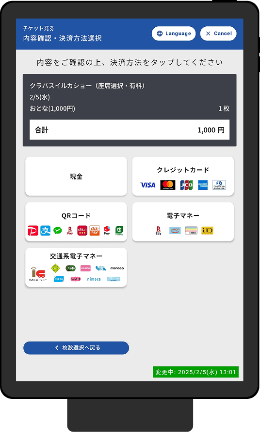購入内容を確認し、支払い方法(現金・クレジットカード・QRコード決済など)を選択して決済します。