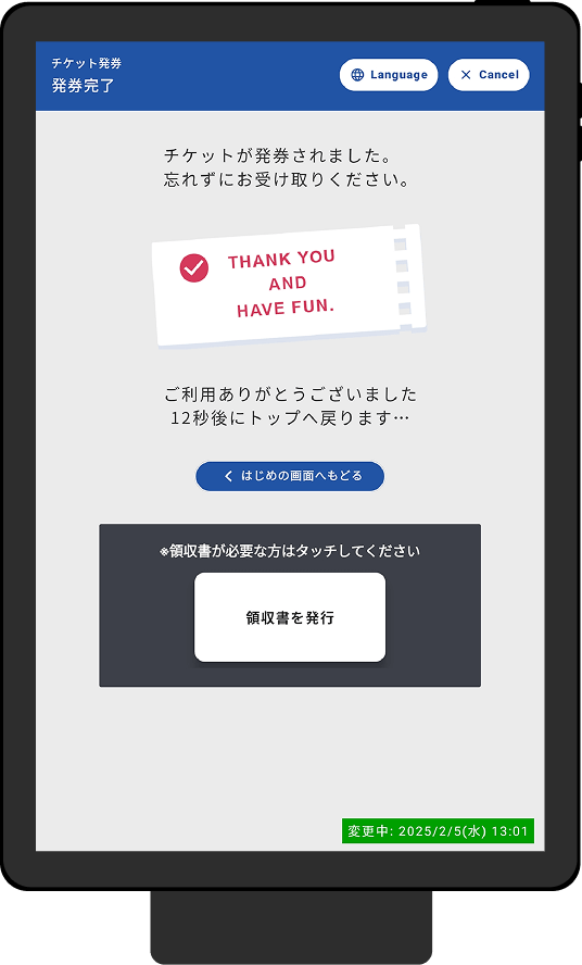 決済が正常に完了すると、券売機からチケットが発券されます。