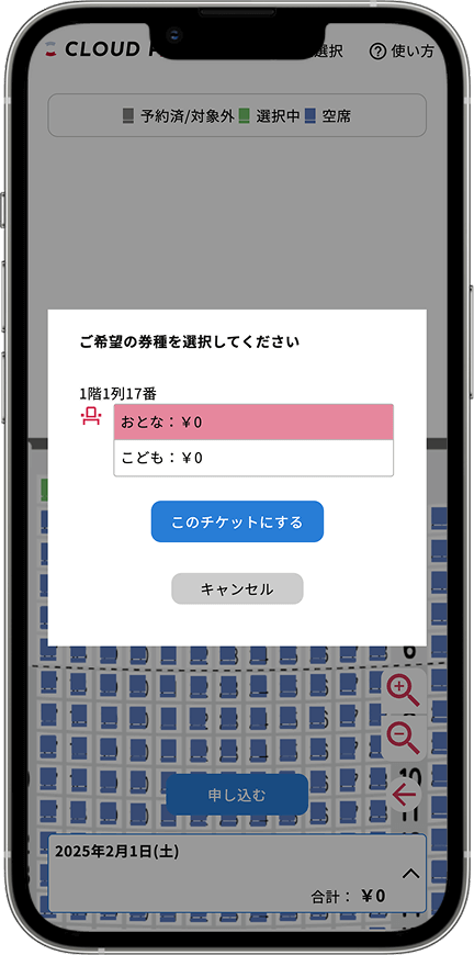 選択した座席に対して、券種(例:おとな/こども/一般/学生など)を選びます。