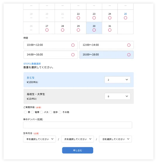 - フォーム項目は無制限にカスタマイズ可能。日時・時間枠ごとの申込制御や、先着・抽選などの販売方式に対応し、事前アンケートにも活用可能です。