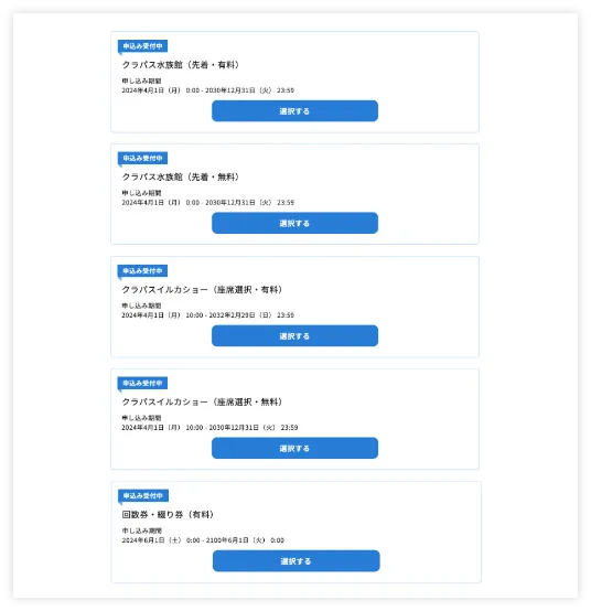 イベントごと、販売区分ごとに柔軟な予約設計が可能です。
