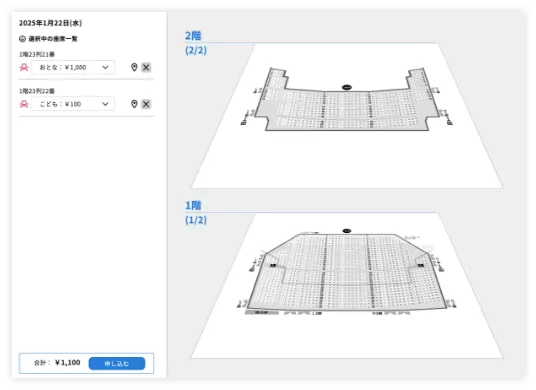 - 申込者自身による座席選択に加え、自動・手動配席や席種設定が可能。円卓やフロアが分かれた会場にも対応でき、券面への座席番号表示により当日の誘導もスムーズです。
