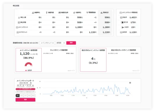 - 予約・販売状況や受付状況、タッチポイント機能による来場者動向を、管理画面からリアルタイムで確認可能。媒体別のチケット在庫管理も自動化でき、運営・集計業務を効率化します。