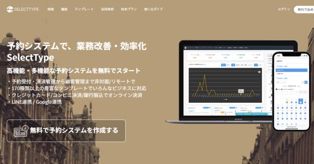 SelectType(セレクトタイプ)は、170種類以上の豊富なテンプレートを利用し、すぐに予約システムを導入できるサービスです。